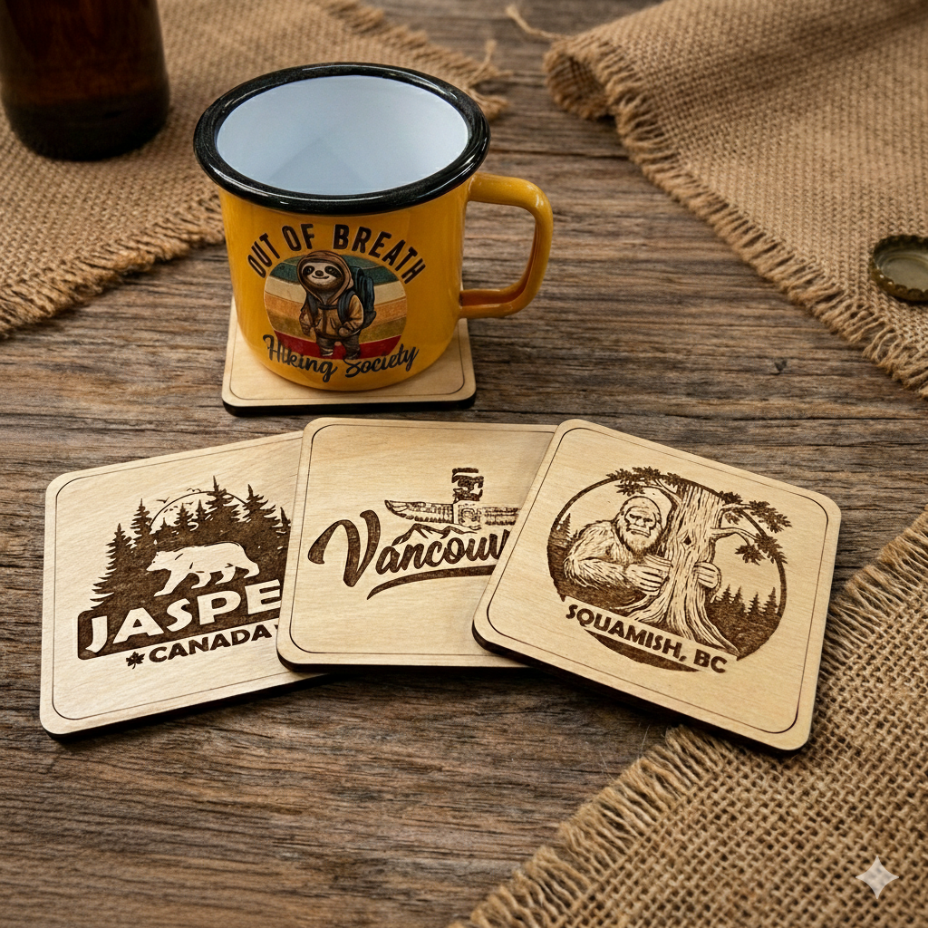 Our laser-engraved wooden coasters are crafted in Canada from quality wood and finished with clean, precise engraving that holds up to real use. Made entirely in-house, they come with quick turnaround times and reliable consistency from run to run. Coaster designs can be easily customized for specific locations, landmarks, or messaging, making them ideal for regional retail and branded sets. If you’re looking for something more distinctive, we can create custom coaster designs from scratch—tailored to your space, style, and story.